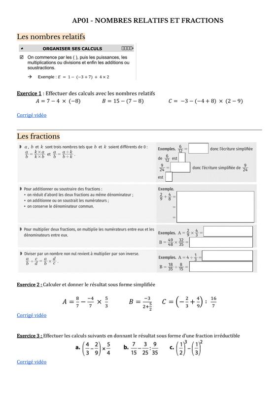 AP01 - LE COURS : Les fractions - Quatrième - Troisième